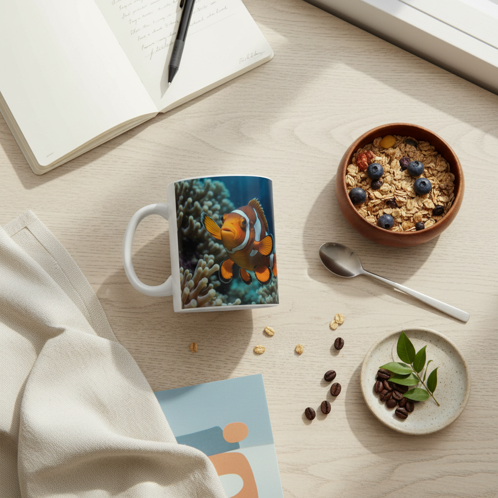 Dive into your morning routine with a splash of color and charm using our captivating clownfish-themed coffee mug. This eye-catching 11-ounce mug is made from high-quality white ceramic, the perfect backdrop for the striking and playful clownfish designs that seem to swim right off the surface thanks to cutting-edge printing technology.